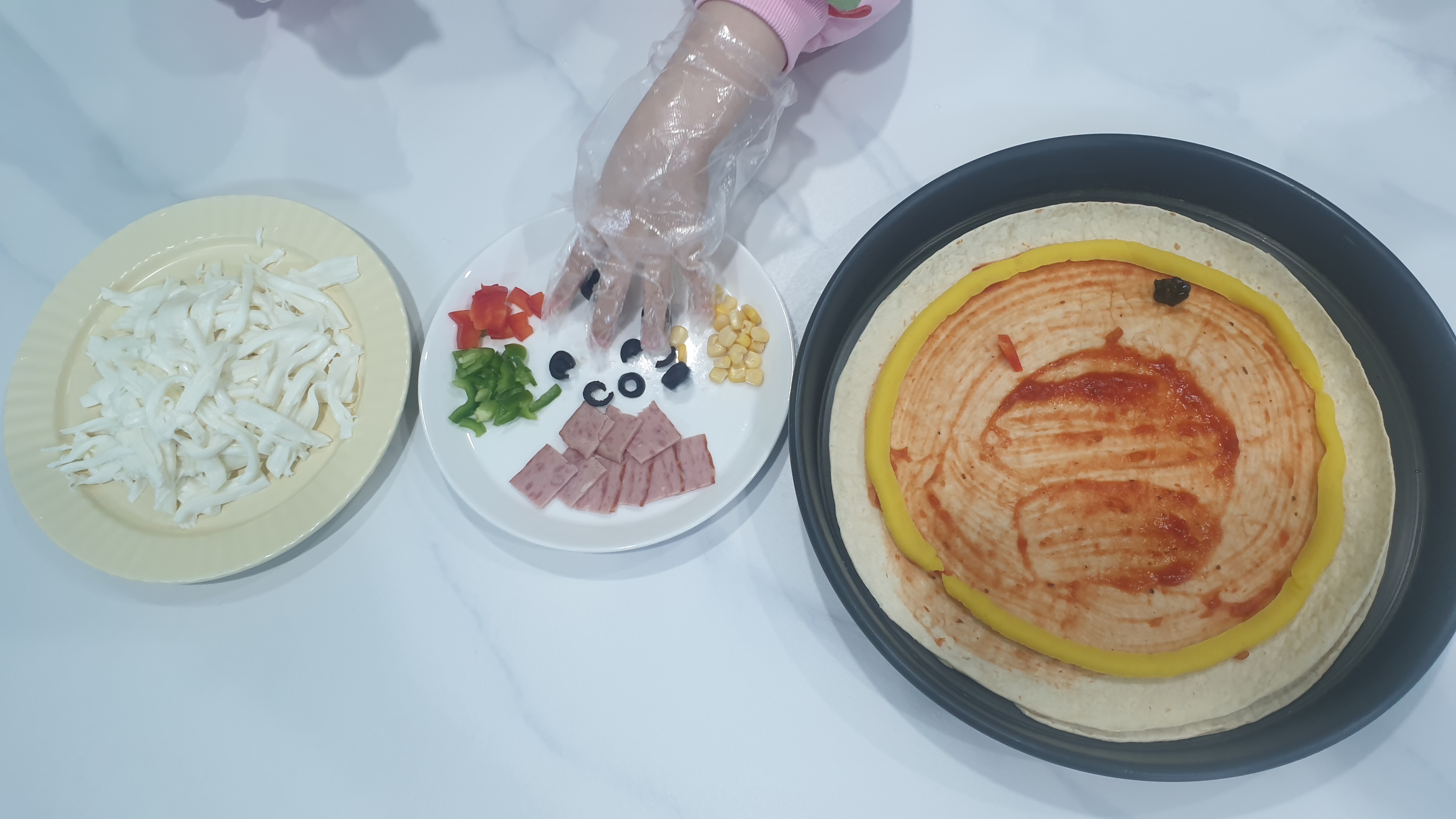 발라진 소스위로 제공된 야채를 먼저 올리고 마지막에 치즈를 올려줍니다.