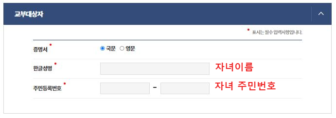 4. 교부대상자 정보에는 발급 받으실 자녀이름과 자녀주민번호 적어주시고 증명서종류 (국문/영문) 선택해 주시면 됩니다.