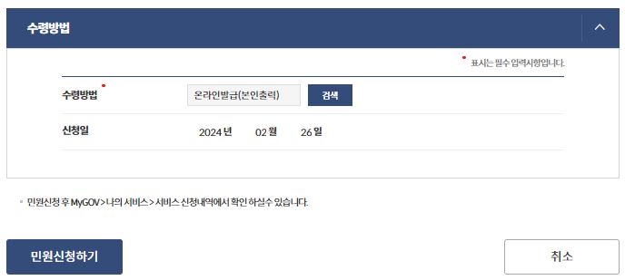 6. 수령방법 선택해 주시고 '민원신청하기' 클릭해 주세요.