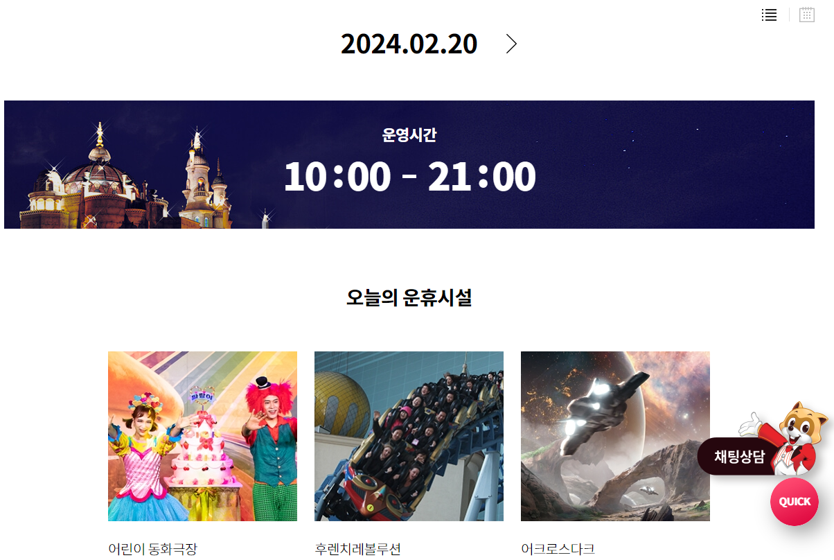 모든 놀이시설은 연중무휴로 운영하지 않으며, 놀이시설 휴무일은 사전에 홈페이지에서 확인 가능합니다. 아래 링크에서 간편하게 일자별로 확인해 보세요