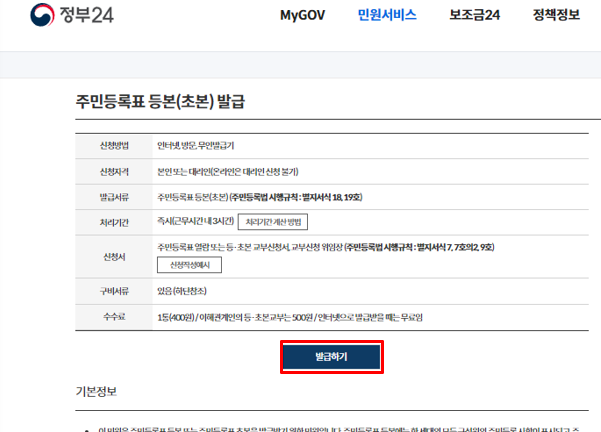 1. 정부 24에 접속해 [주민등록표 등본(초본) 발급] 메뉴에 접속하여 발급하기 버튼 클릭합니다.